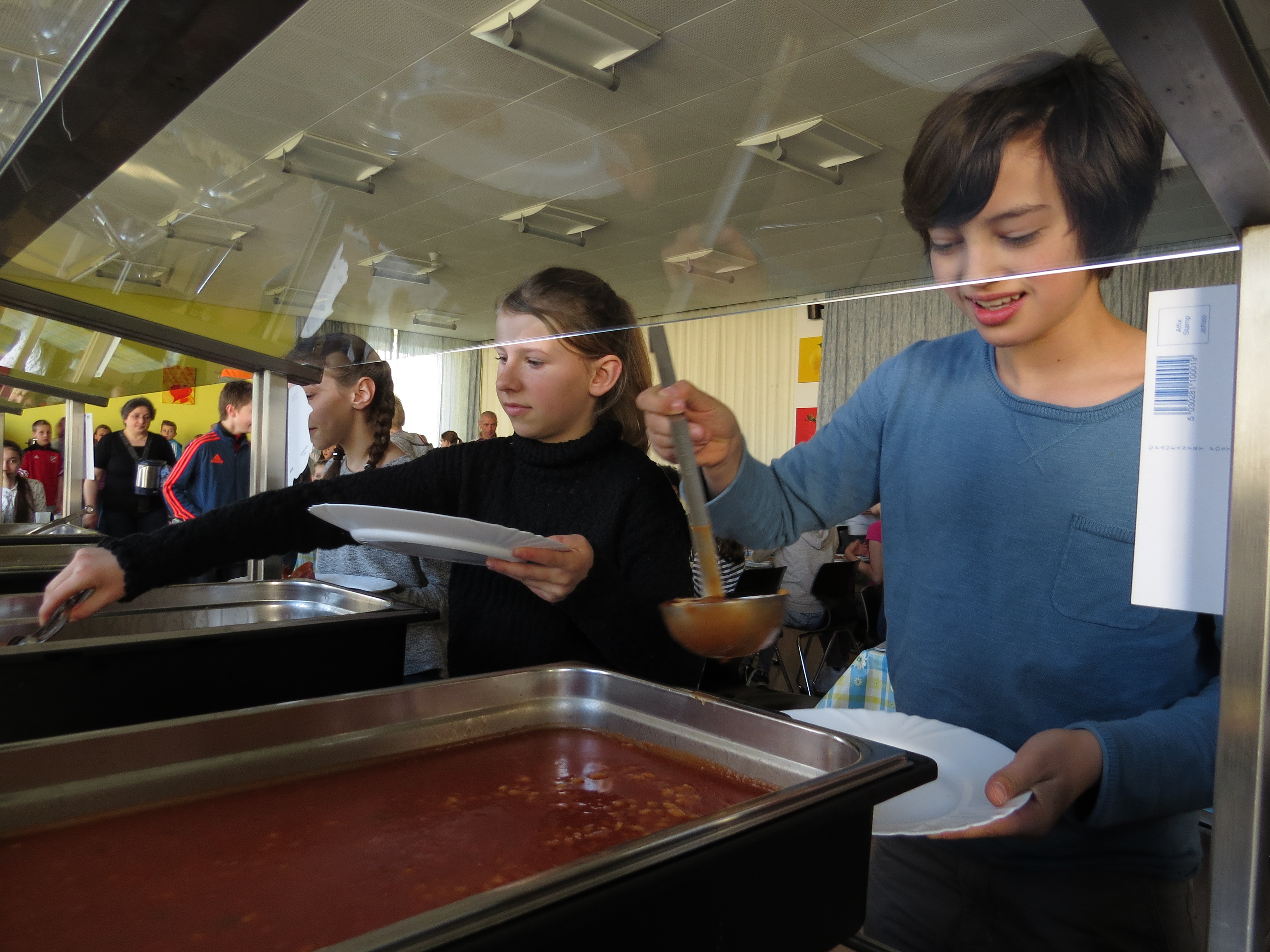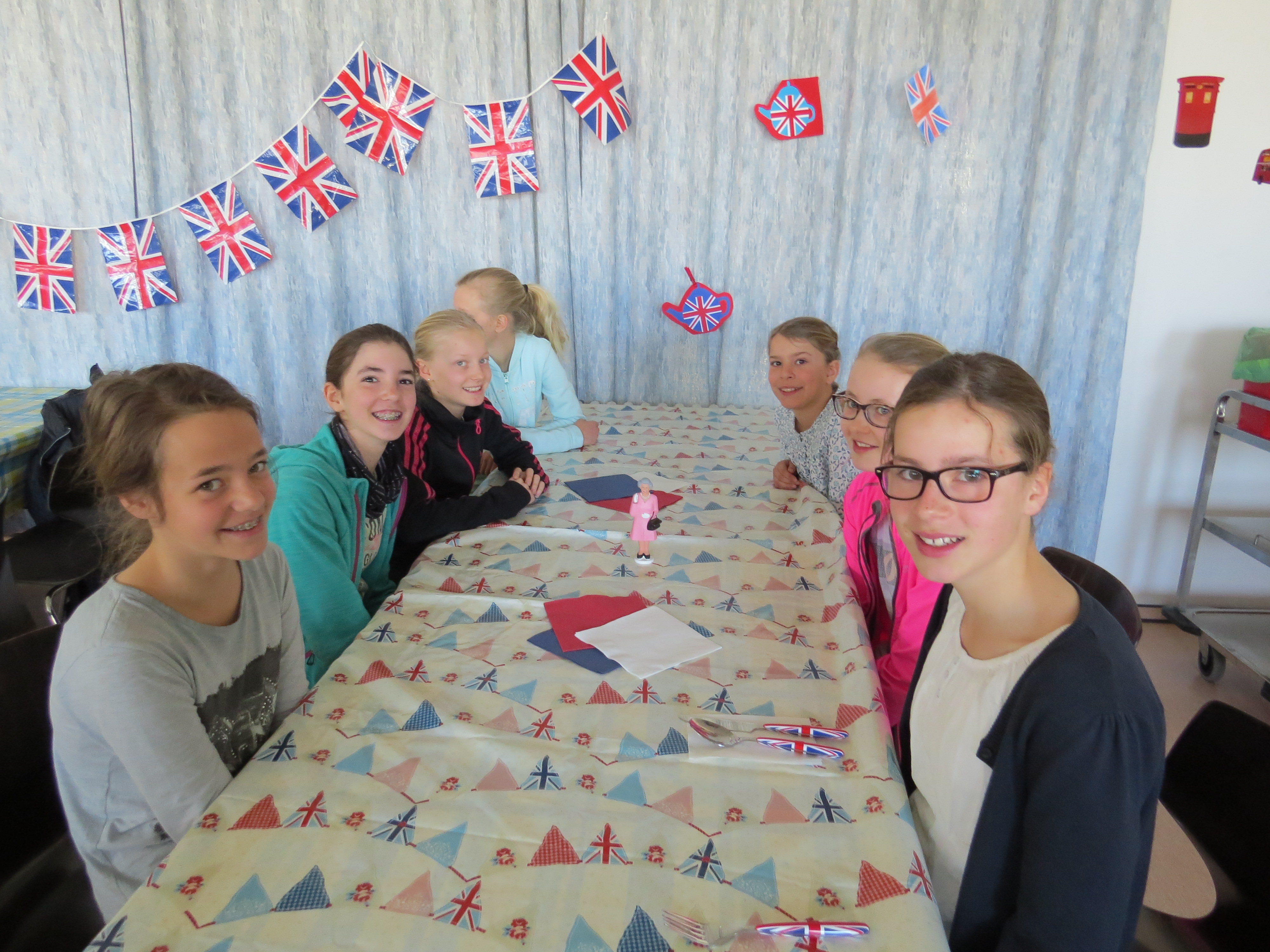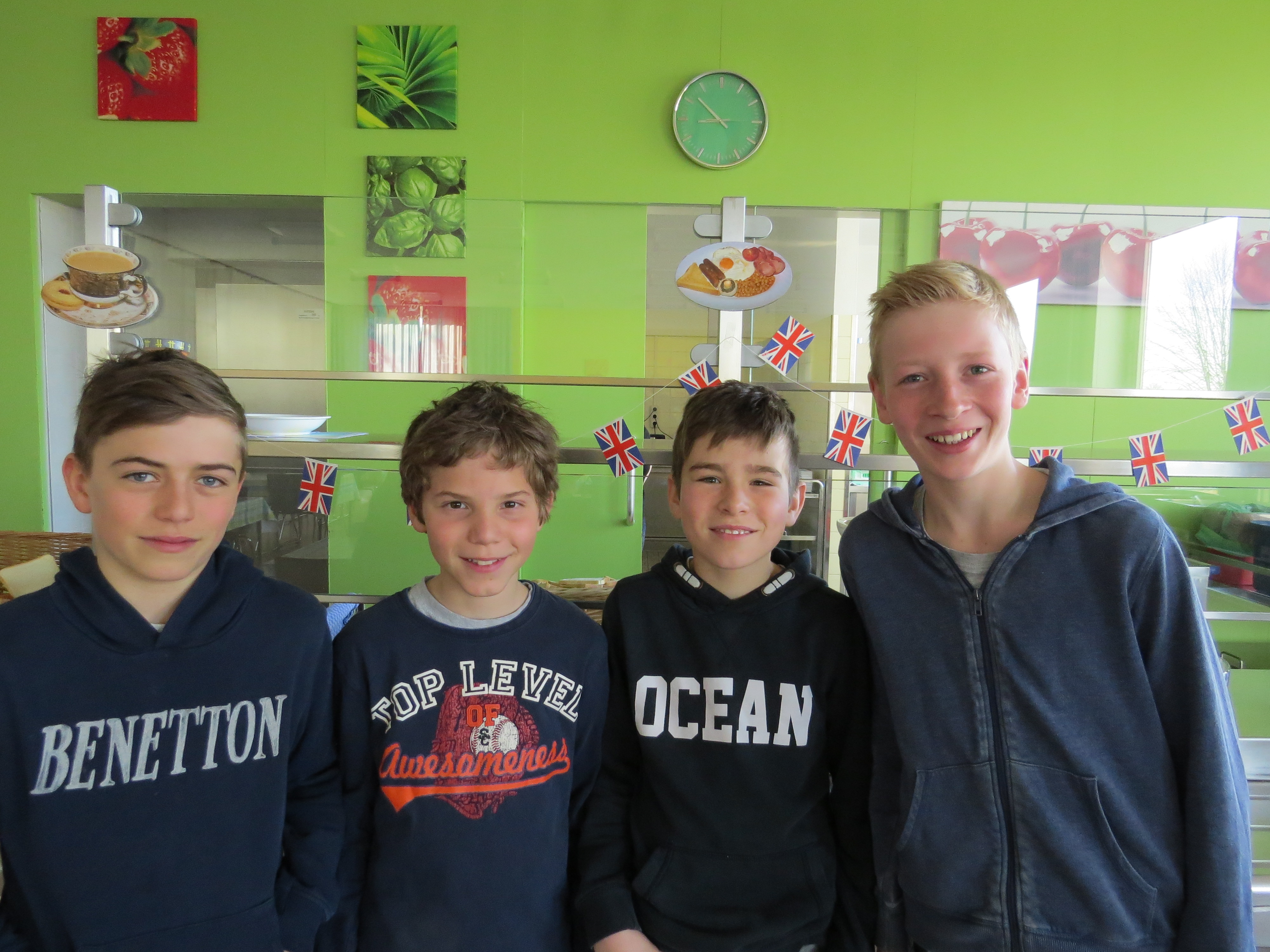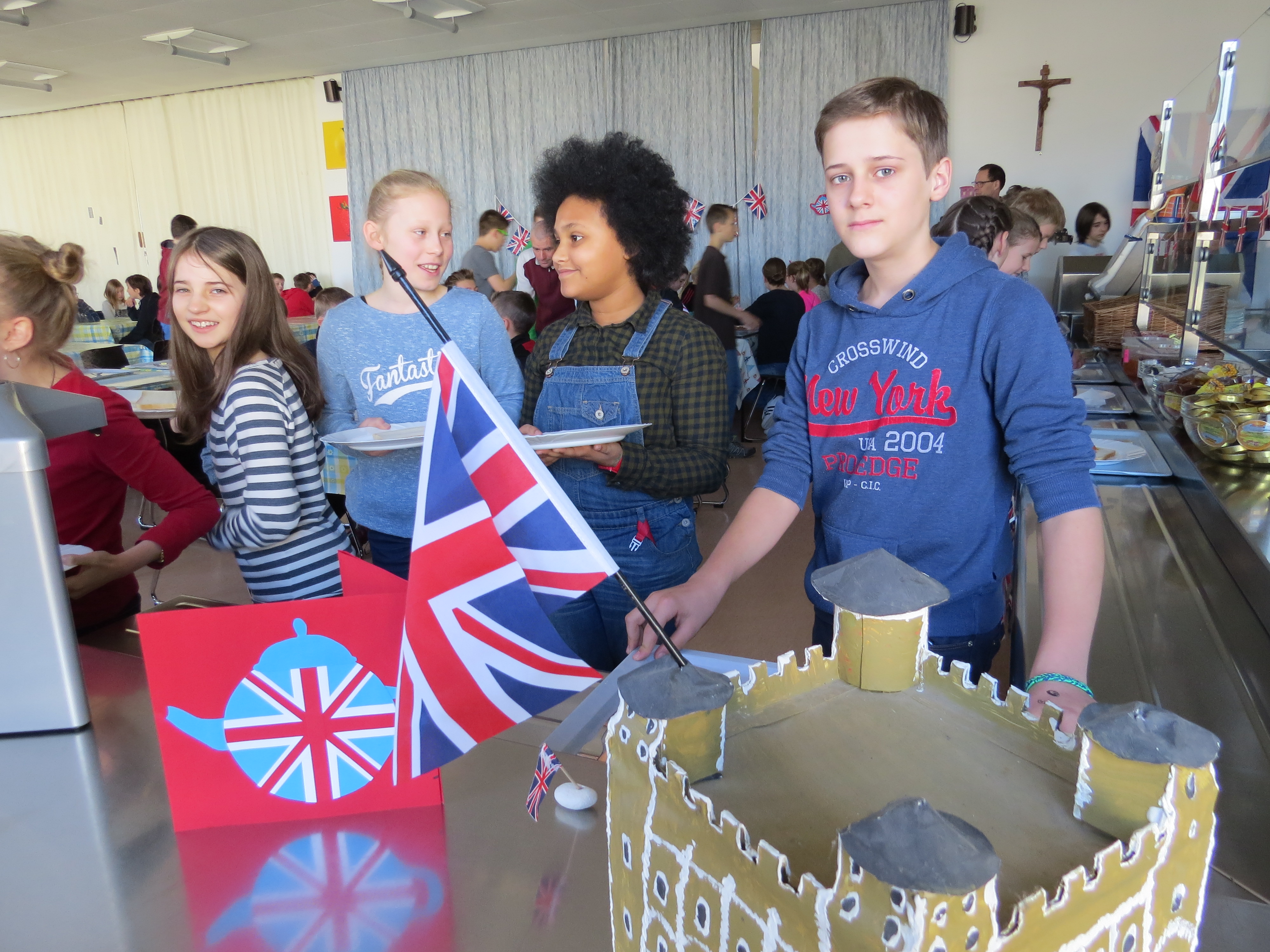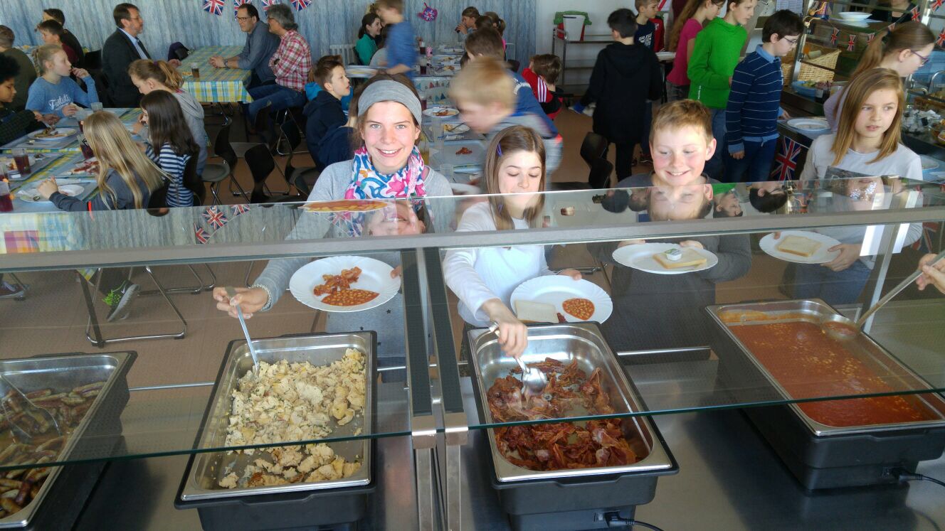 Ein köstlicher Geruch von bacon, scrambled eggs, sausages, baked beans in tomato sauce und toast durchzog am Dienstagmorgen, 28. März 2017, den Speisesaal des Internats, denn Herr Kleybor und sein Küchenteam hatten für die ca 100 Schüler unserer 6. Klassen und ihre Englischlehrkräfte ein kulinarisches Highlight - ein Full English Breakfast - zubereitet. Typisch englische marmalade sowie strawberry jam und honey und jede Menge Tee durften dabei natürlich nicht fehlen. Die Mensa war farblich im frischen United Kingdom - Look dekoriert und man musste auch erst einmal in einer ordentlichen englischen queue Schlange stehen, bevor man sich die Köstlichkeiten auf den Teller laden konnte. „It is so good“ – sagten Luca Goettelmann und seine Freunde aus der 6a, und wer großen Hunger hatte, der durfte sich auch ein zweites oder drittes Mal bedienen. Schön, dass unser Schulleiter, Herr Mooser, und sein Stellvertreter, Herr Böhler, der liebevoll englisch gestalteten Einladung der Kinder folgten und sich Zeit für unser traditionelles English Breakfast nahmen.