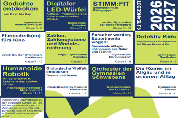 In den Kursen des Begabungsstützpunktes erhalten die Schüler die Möglichkeit, sich besonders intensiv mit den Themen ihres Kurses zu befassen. Teamarbeit, Projekte und Exkursionen sind zentrale Bestandteile des Unterrichts: Auf die Interessen der Schüler kann in diesem Rahmen stärker eingegangen werden, als das im „normalen“ Schulbetrieb möglich wäre. Auch im kommenden Schuljahr wird es am Begabungsstützpunkt Gymnasium Marktoberdorf für neugierige Schüler/-innen aller Altersstufen insgesamt 11 Kurse aus den verschiedensten Bereichen von Robotik über Sprachen, Film, Geschichte und Musik bis hin zu Chemie, Mathematik, und Informatik geben, darunter diesmal sogar zwei an der Hochschule für angewandte Wissenschaften in Kempten. Neugierig geworden? Dann schaut doch mal rein in unser Angebot: