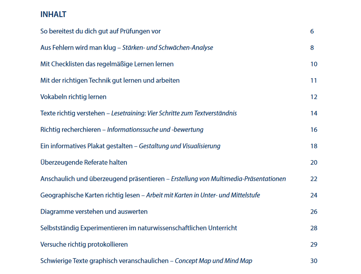 Der erste Band für die 5. und 6. Klasse ist Bestandteil einer Reihe, die alle wichtigen Basismethoden trainiert, die man für einen erfolgreichen Start am Gymnasium beherrschen sollte. Die 15 verschiedenen Bausteine folgen einer stärken- und damit kompetenzorientierten Pädagogik und damit dem Ziel einer fächerübergreifenden und ganzheitlichen Förderung von Kindern und Jugendlichen. Hier ein kleiner Auszug aus den behandelten Themen: