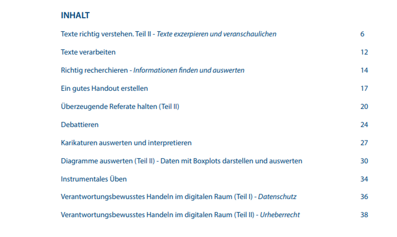 Die elf Bausteine des zweiten Methodenhefts für die 7./8. Jahrgangsstufe bauen zum Tel auf dem ersten Heft auf (z. B. "Texte verstehen", "Referate halten", "Diagramme auswerten"), andere Kapitel wiederum thematisieren Methoden, die der Kompetenzorientierung des LehrplanPLUS Rechnung tragen (z. B. "Richtig recherchieren", "Ein gutes Handout erstellen", "Debattieren" oder "Instrumentales Üben". Ein wichtiger Bestandteil ist auch der Bereich "Verantwortungsbewusstes Handeln im digitalen Raum".