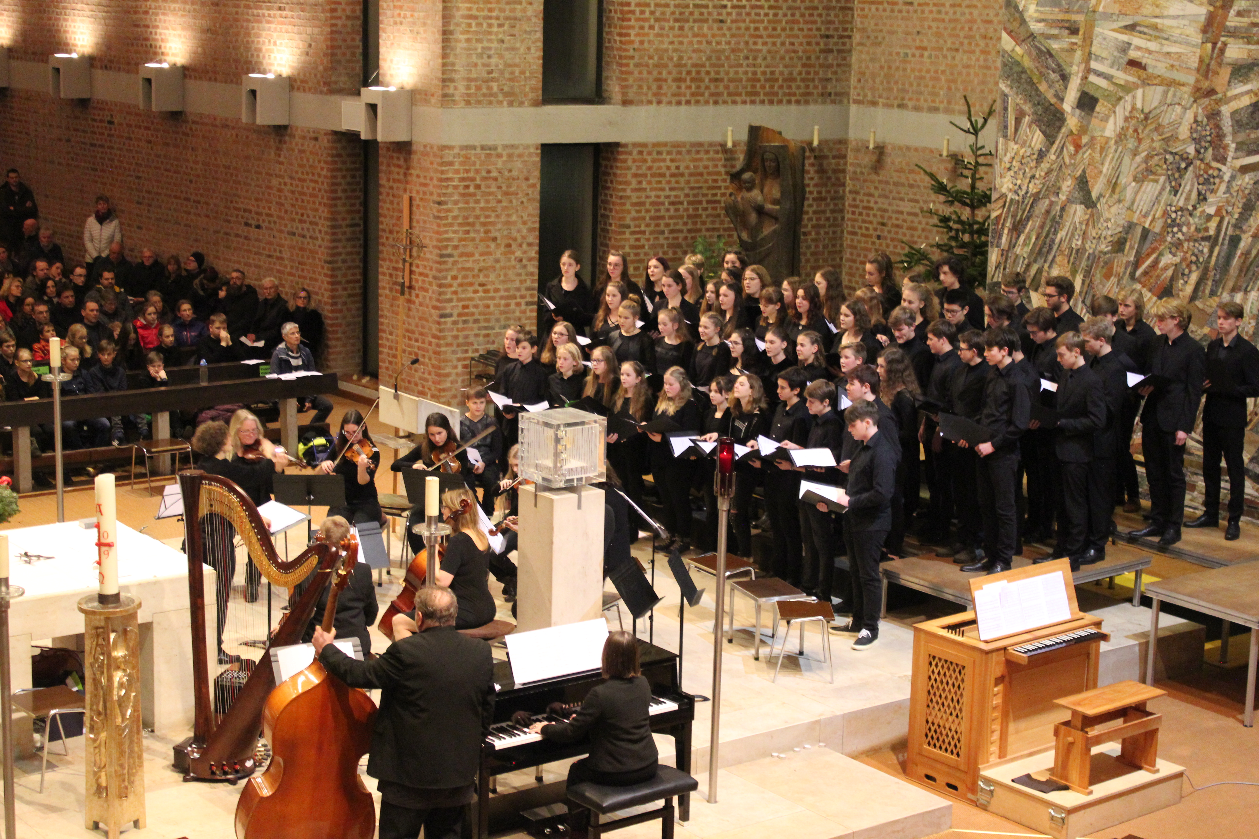Es ist schon eine Tradition, die weit über die Schulfamilie hinaus für Vorfreude in Marktoberdorf sorgt: das Weihnachtskonzert unserer Schule, das auch diesmal wieder ein echter Publikumsmagnet war. Schüler, Eltern und Lehrer strömten in die St. Magnuskirche, um sie bis auf den letzten Sitzplatz - und darüber hinaus! - zu füllen. Wieder hatten die insgesamt über 300 musikalisch aktiven Schülerinnen und Schüler mit ihren Lehrkräften ein stimmiges und stimmungsvolles Programm einstudiert, mit dem sie das Publikum auf das Weihnachtsfest einstimmten. Dabei erklangen eindrucksvolle und berührende Werke von Händel, Liadov, Rutter und Schütz, die nicht nur exzellente musikalische Arbeit der Ensembles vom Unterstufenchor und Nachwuchsorchester über die Vokalensembles bis hin zu den "großen Chören" und dem Sinfonieorchester dokumentierten, sondern auch eine sehr weihnachtliche, fröhlich-besinnliche Atmosphäre schufen. Hier können Sie sich in einer Fotogalerie einen optischen Eindruck von diesem akkustischen Hochgenuss verschaffen.