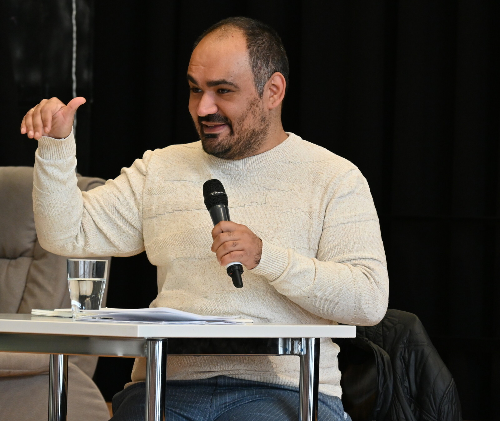 Ein erfahrener, souveräner Bühnenmensch, der selbstbewusst und selbstironisch auftritt – und sich dabei gleichzeitig von einer leisen, feinsinnigen Sensibilität zeigt. Kein Attribut scheint so wirklich auf Dinçer Güçyeter zuzutreffen – und er genießt es sichtlich, in keine gängige Kategorie zu passen. Direkt und offen berichtet er den Schüler*innen von seinem eigenen (langen) Weg zum Schreiben, er verschweigt nicht, wie oft er anfangs ausgelacht wurde, dass er nahezu alle seine frühen Gedichte vernichtet hat, weil er erkannte, dass er nur andere, fremde Gedichte nachahmte, aber seine eigene Stimme noch nicht gefunden hatte.