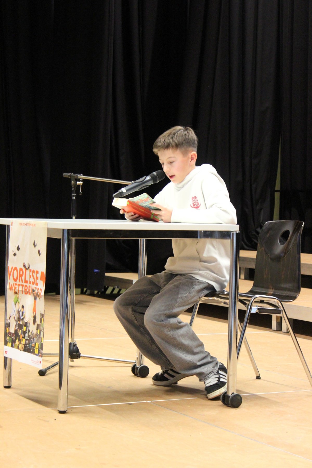 Entsprechend gespannt, ruhig und diszipliniert zeigten sich dann auch die fünf sechsten Klassen als Publikum für den Vorlesewettbewerb des deutschen Buchhandels. Nacheinander erlebten die Sechstklässler und die Jury (Herr Brücklmayr für die Schulleitung, Frau Krieger für den Elternbeirat, Maya Zimmermann als Schülersprecherin, Herr Dr. Köck für die Fachschaft Deutsch) nun die erste Runde, in der die fünf Klassensieger jeweils drei Minuten aus einem selbst ausgewählten Werk vorlasen. Dabei griff Pius Bräckle (6a) auf einen sehr „prominenten“ Helden zurück: Viele Schülerinnen und Schüler kennen und lieben die Figur des von J. K. Rowling erfundenen Zauberschülers Harry Potter – ein unterhaltsamer Einstieg! Weniger bekannt, aber nicht minder lustig sind die Verwicklungen in „Pfeffer und Minze“ von Sarah Welk, die Emma Schreyer aus der 6b präsentierte, gefolgt von Rick Riordans Dauerbrenner „Percy Jackson“, den sich Nepomuk Oberheide (6c) vornahm. Lena Canzian (6g) wiederum kredenzte ihren faszinierten Mitschülern „Die Insel der Smartphone-Waisen“ von Salah Naoura. Einen echten Klassiker hatte sich Naemi Goral (6m) ausgesucht: Sie trug das spannende Ende von Otfried Preußlers „Krabat“ vor.