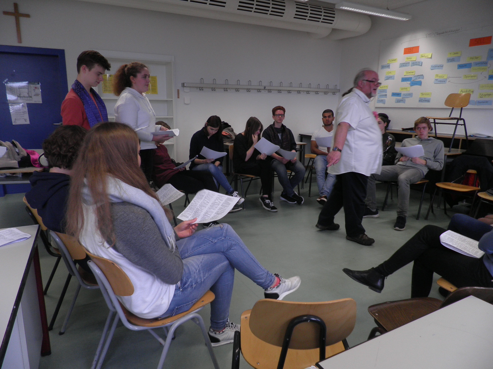 Reading passages from a shortened script while using us students to pose as the main characters of the play, he helped us to understand their feelings, motives and, consequently, their actions.