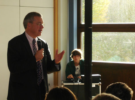 Dabei zeigt sich der 46-jährige studierte Elektro-Ingenieur, der seit 1994 im EU-Parlament sitzt, nicht nur als echter „Insider“, der kenntnisreich aus der politischen Praxis in Brüssel und Straßburg zu berichten weiß, sondern auch als lebendiger Erzähler, der das mitunter recht komplizierte Geflecht der Europäischen Union anschaulich und anekdotenreich entwirrte. Nach einem kurzen Galopp durch die europäischen Institutionen und Gremien kam Ferber erwartungsgemäß schon bald auf die aktuelle Euro-Krise zu sprechen, deren Ursachen und Folgen er pointiert skizzierte. Die Schüler erfuhren, wie der Rettungsschirm EFSF funktioniert, warum eine „Ansteckungsgefahr“ für andere EU-Länder wie Spanien, Portugal oder Italien besteht, falls die Griechen das Sparpaket und die damit verbundenen Reformmaßnahmen nicht umsetzen und warum Deutschland ein vitales Interesse an einem stabilen Euro haben muss: So würde eine Rückkehr zur harten D-Mark deutsche Produkte extrem verteuern und damit den Export erheblich schwächen – am Beispiel der Schweiz mit ihrem starken Franken könne man das ersehen.