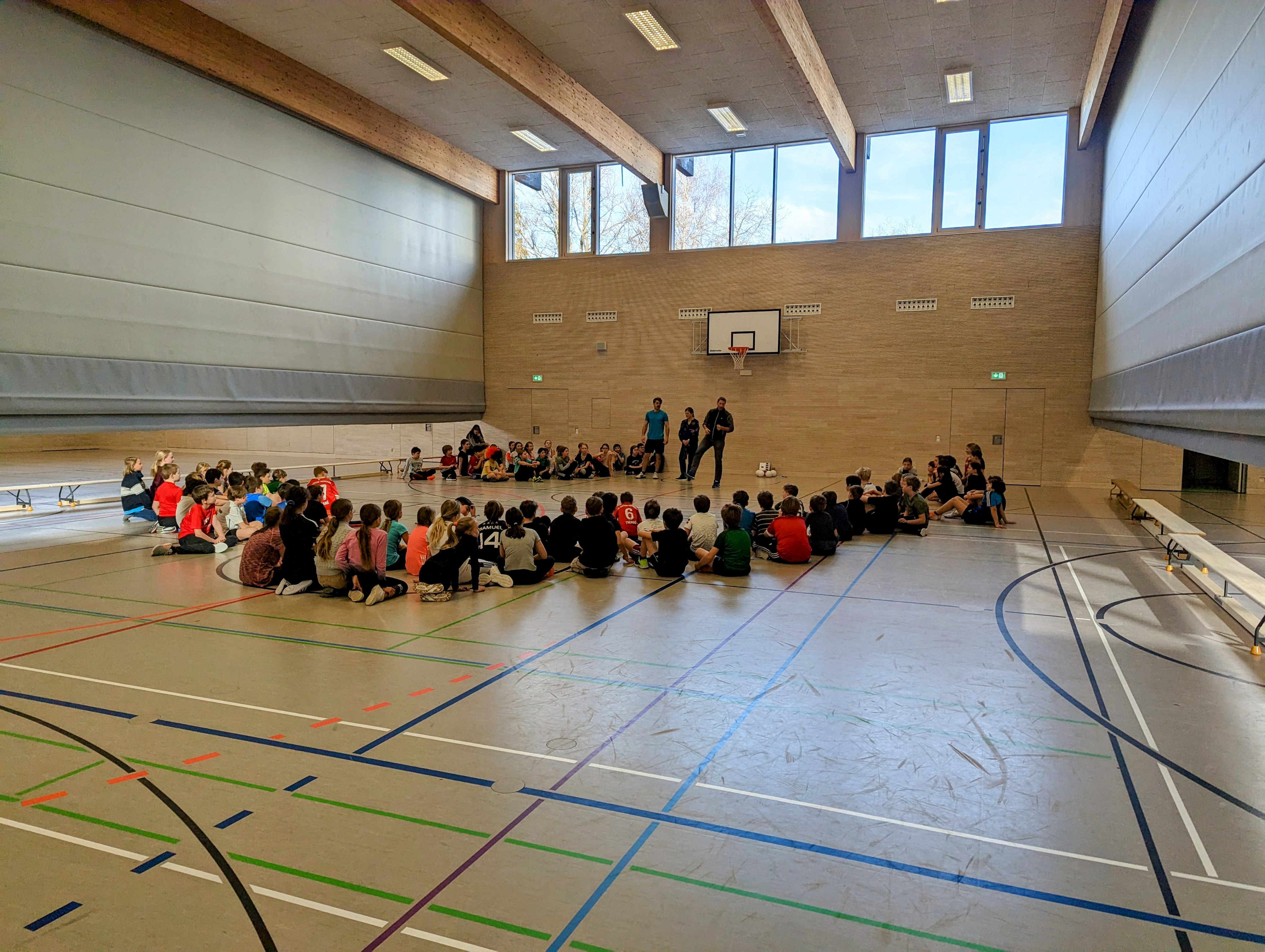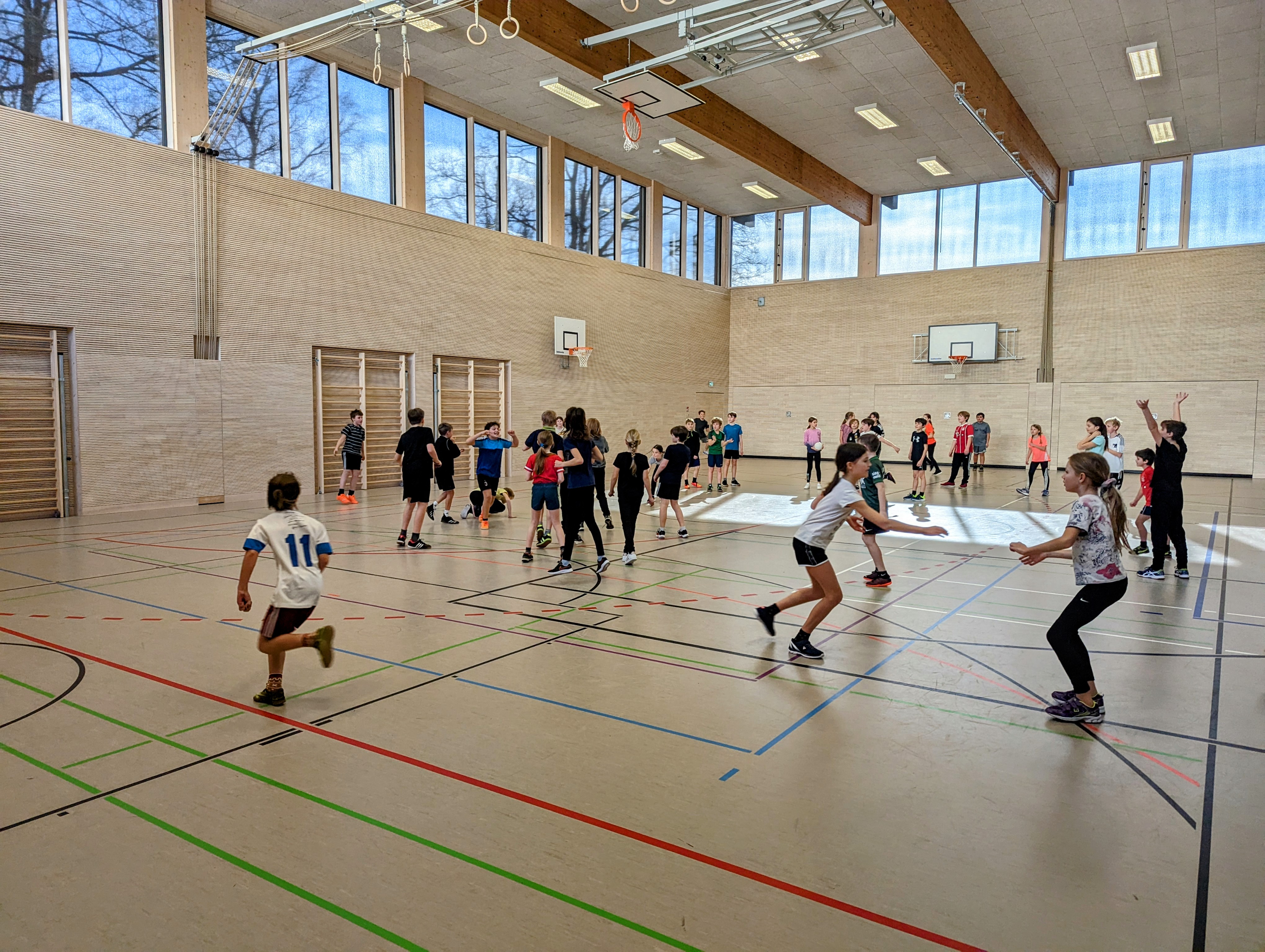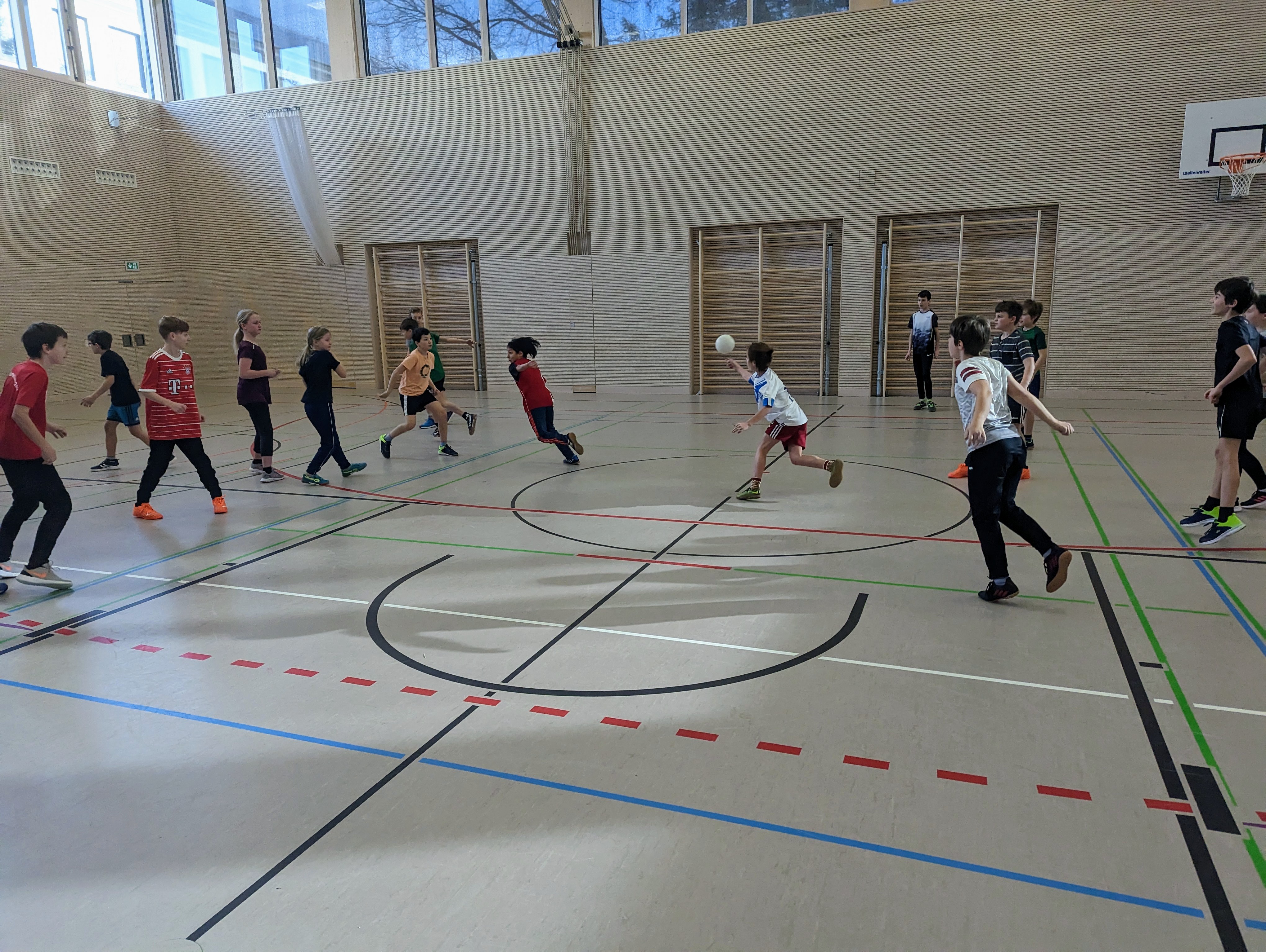 In der letzten Sportstunde vor den Faschingsferien veranstalteten die Sportlehrkräfte ein Jahrgangsstufenturnier für die fünften und sechsten Klassen. Der Modus versprach spannende Spiele, da immer fast die ganze Klasse auf dem Platz stand und jede Klasse gegeneinander spielte. Vor Spielbeginn wurden alle auf die Spielregeln und den Fairnessgedanken hingewiesen.