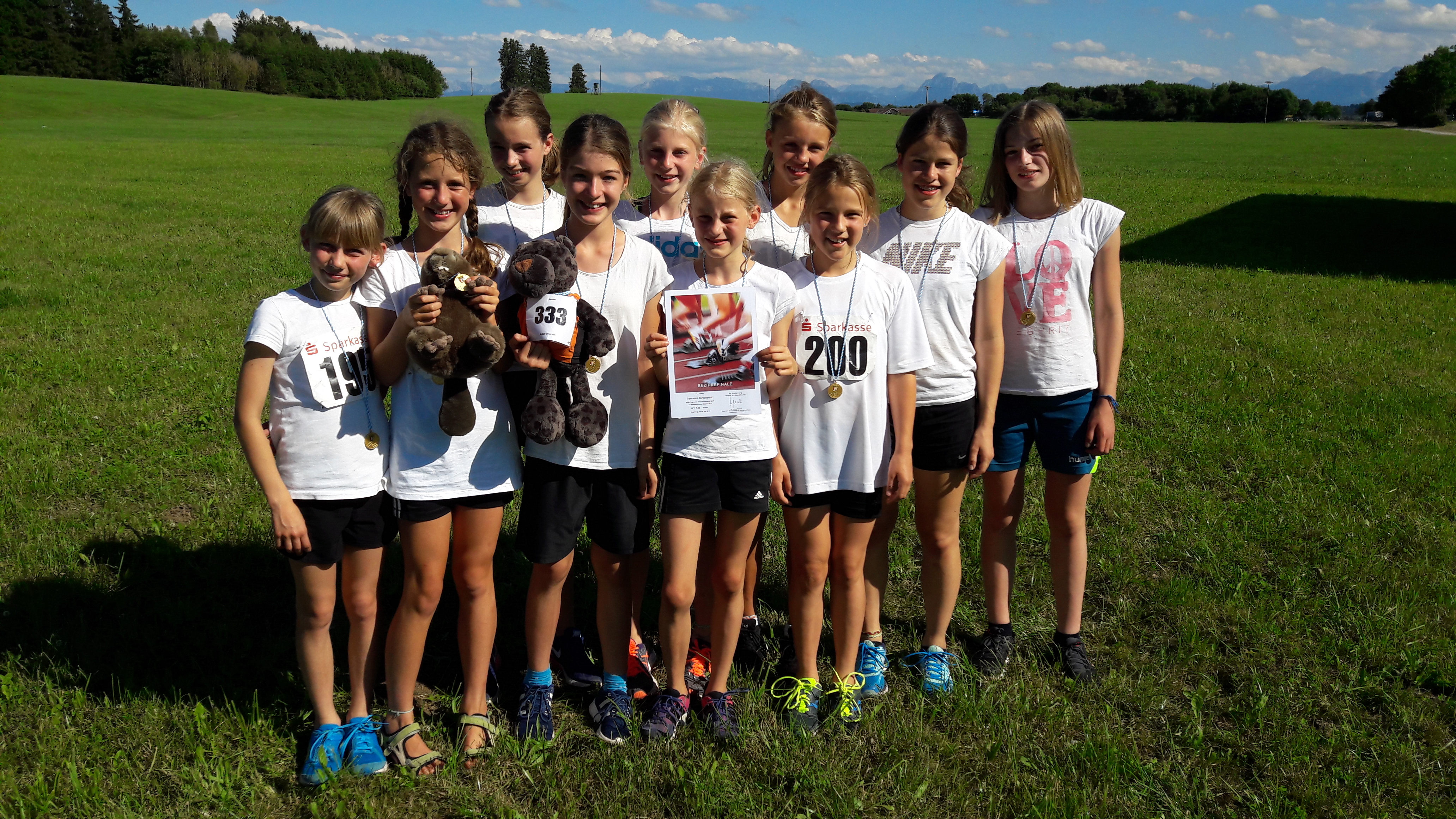 Noch erfreulicher war das Abschneiden der kleinen Mädchen. Nach den Vorleistungen traten sie als Punktbeste in Bayern an. Es entwickelte sich wieder ein extrem knapper Wettkampf. Zunächst führten die Sportlerinnen souverän. Der Vorsprung schrumpfte aber vor dem abschließenden 800 m Lauf auf unter 40 Punkte. Somit zählte in diesem Lauf jede Sekunde. Die Läuferinnen liefen bis zur Erschöpfung und auch aufgrund der Spitzenzeit von Linda Rossmanith (2,37 min) gewannen die Marktoberdorfer Mädchen mit 30 Punkten Vorsprung vor Uffenheim und Bamberg den Titel des Bayerischen Meisters.