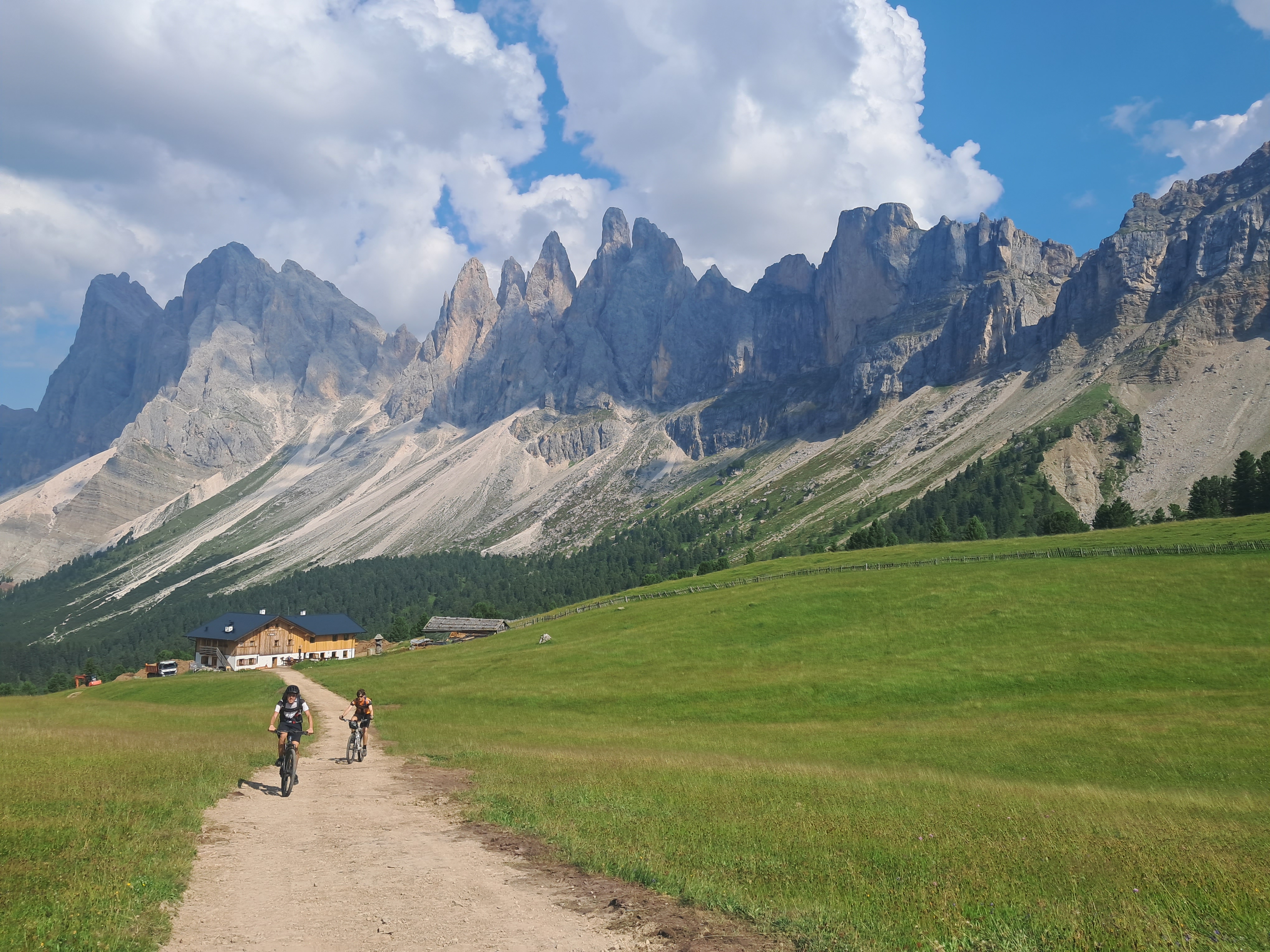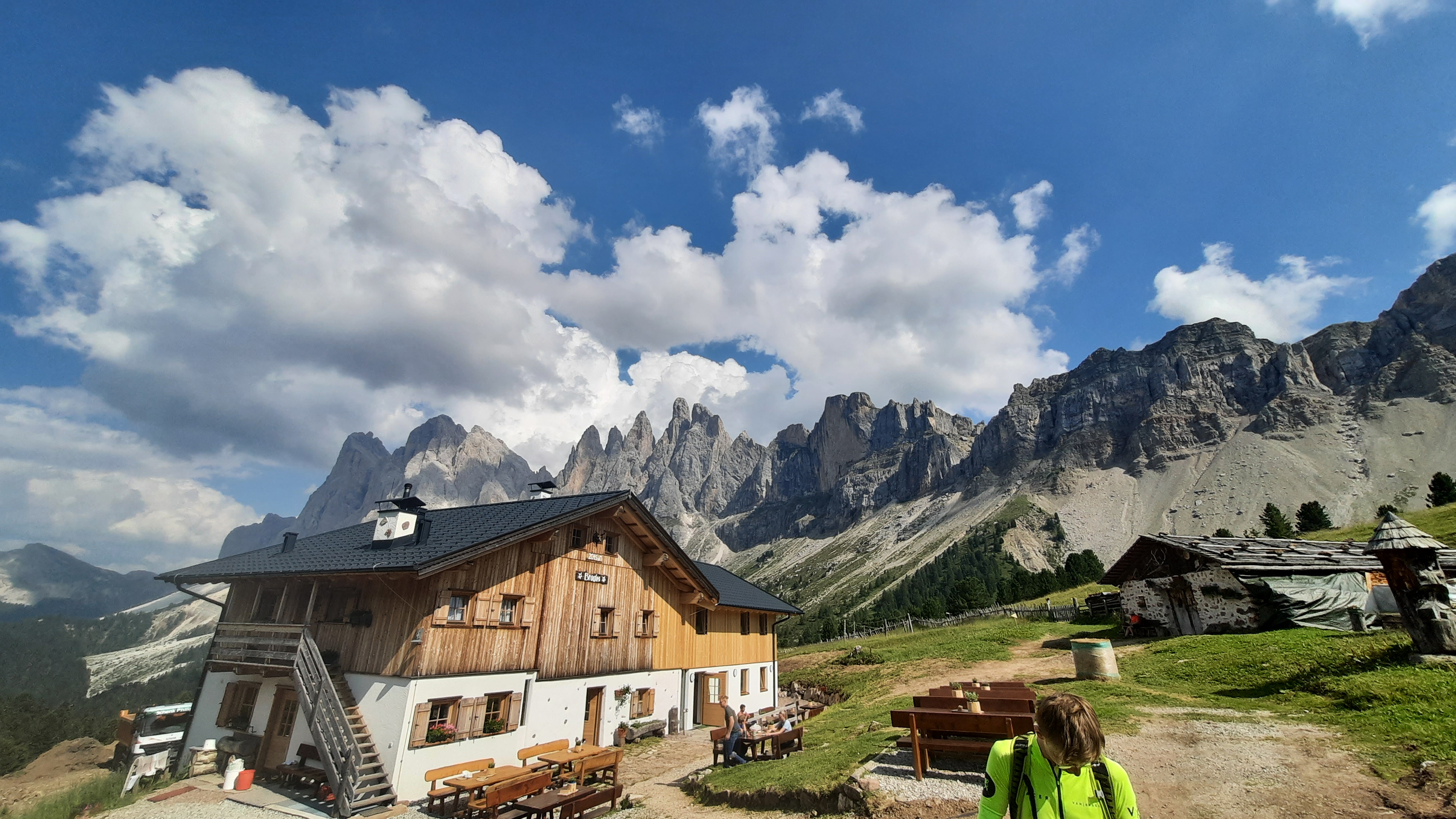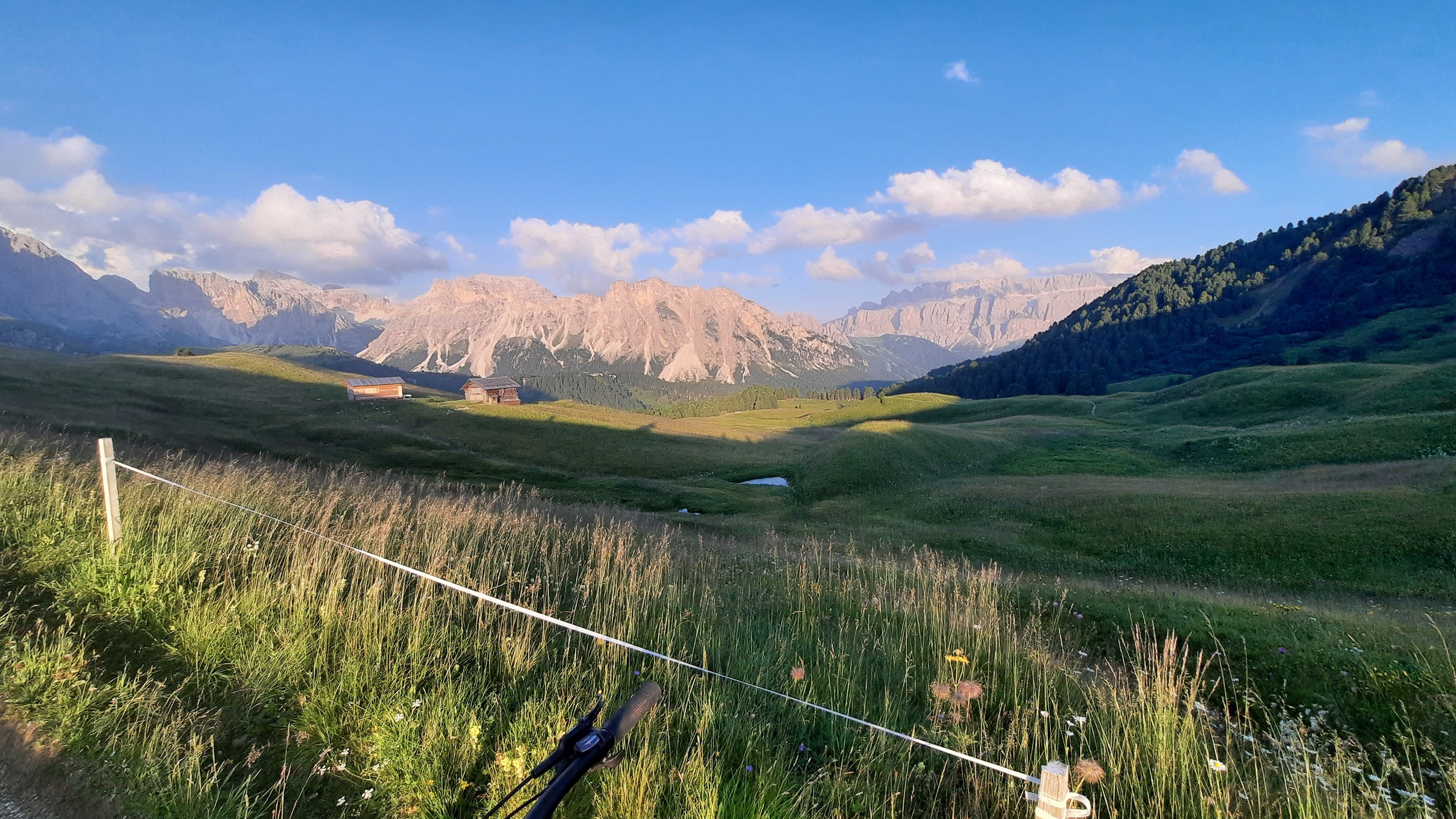 Tag 4: Wir wachen auf der Regensburger Hütte durch die ersten Sonnenstrahlen auf und können direkt als erstes das Panorama auf 2000 m Seehöhe genießen. Nach dem Frühstück besprechen wir dann noch kurz, was an Tag 3 schiefgelaufen ist, und machen uns anschließend auf den Weg talwärts Richtung Bozen. Auch, wenn es einige Anstiege unterwegs gibt, zeigt die Tendenz doch ganz klar nach "unten" und wir kommen zeitig ca. 1700m tiefer als wir gestartet sind in Bozen an. Als wir auf dem Weg zum Begleitfahrzeug sind, um das Gepäck zu holen, werden wir von einem kräftigen Sommergewitter überrascht und kräftig nass. Trotzdem raffen wir uns wieder zusammen und kochen noch gemeinsam.