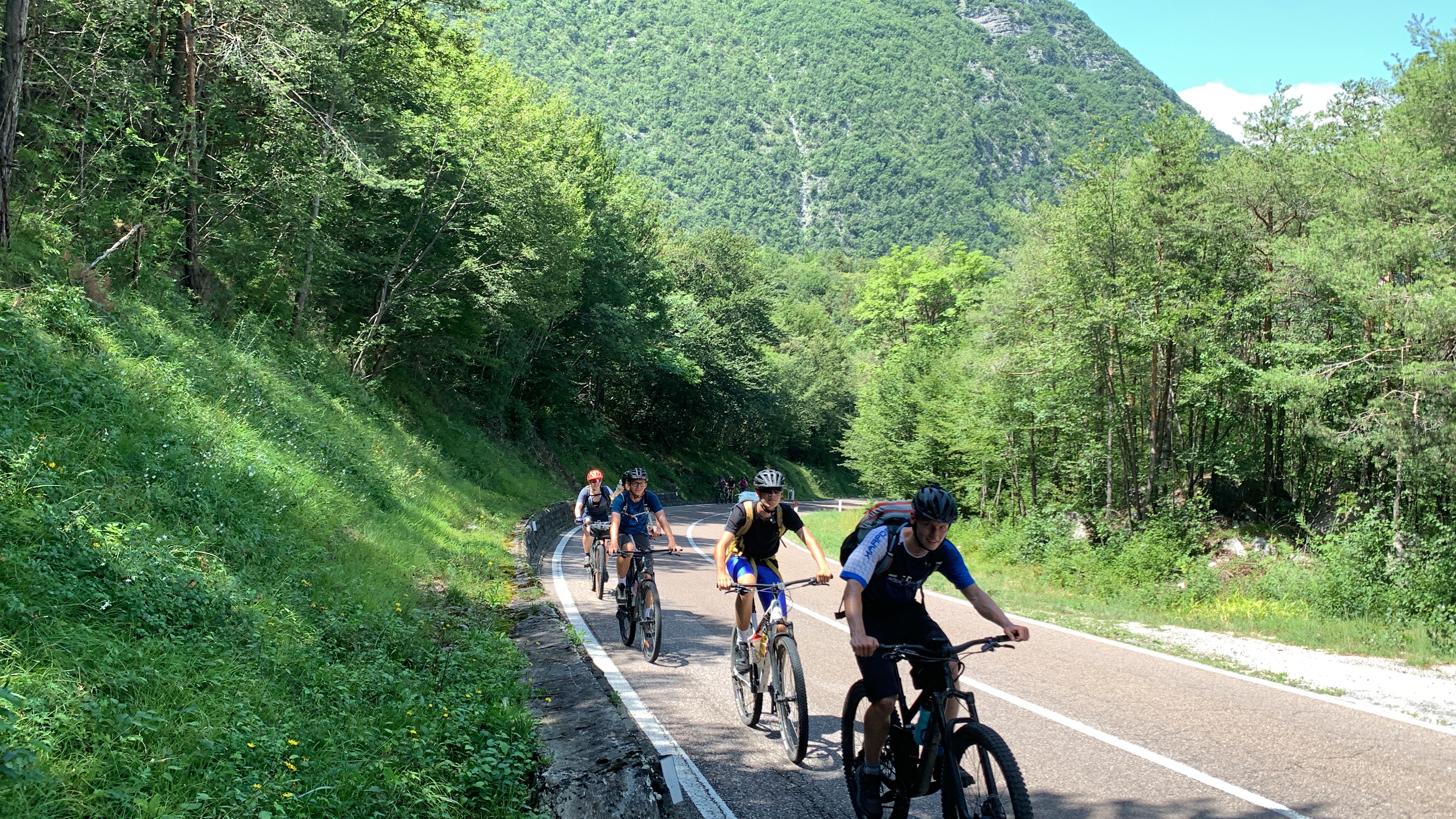 Tag 5: Wir wissen von Anfang an, dass die Höhenmeter nicht ideal verteilt sind. Erst geht es 40 km an der Eisack entlang, bis ca. 700 Meter Anstieg auf den letzten 14 km folgen. Wir starten rechtzeitig, da für den Nachmittag in Andalo Regen angesagt ist. Schon deutlich früher überrascht uns ein heftiges Wärmegewitter, doch genau in diesem Moment kommen wir an einer gastronomischen Einrichtung vorbei, sodass die Mittagspause vorverlegt wird und keiner nass wird. Den Anstieg zum Schluss quälen wir uns hoch und kommen so wohlbehalten in Andalo an, kurz bevor wieder ein Wärmegewitter über uns fegt - Glück gehabt. Nach einem Besuch im SPA lassen wir den Abend gemütlich beim gemeinsamen Pizzaessen ausklingen.