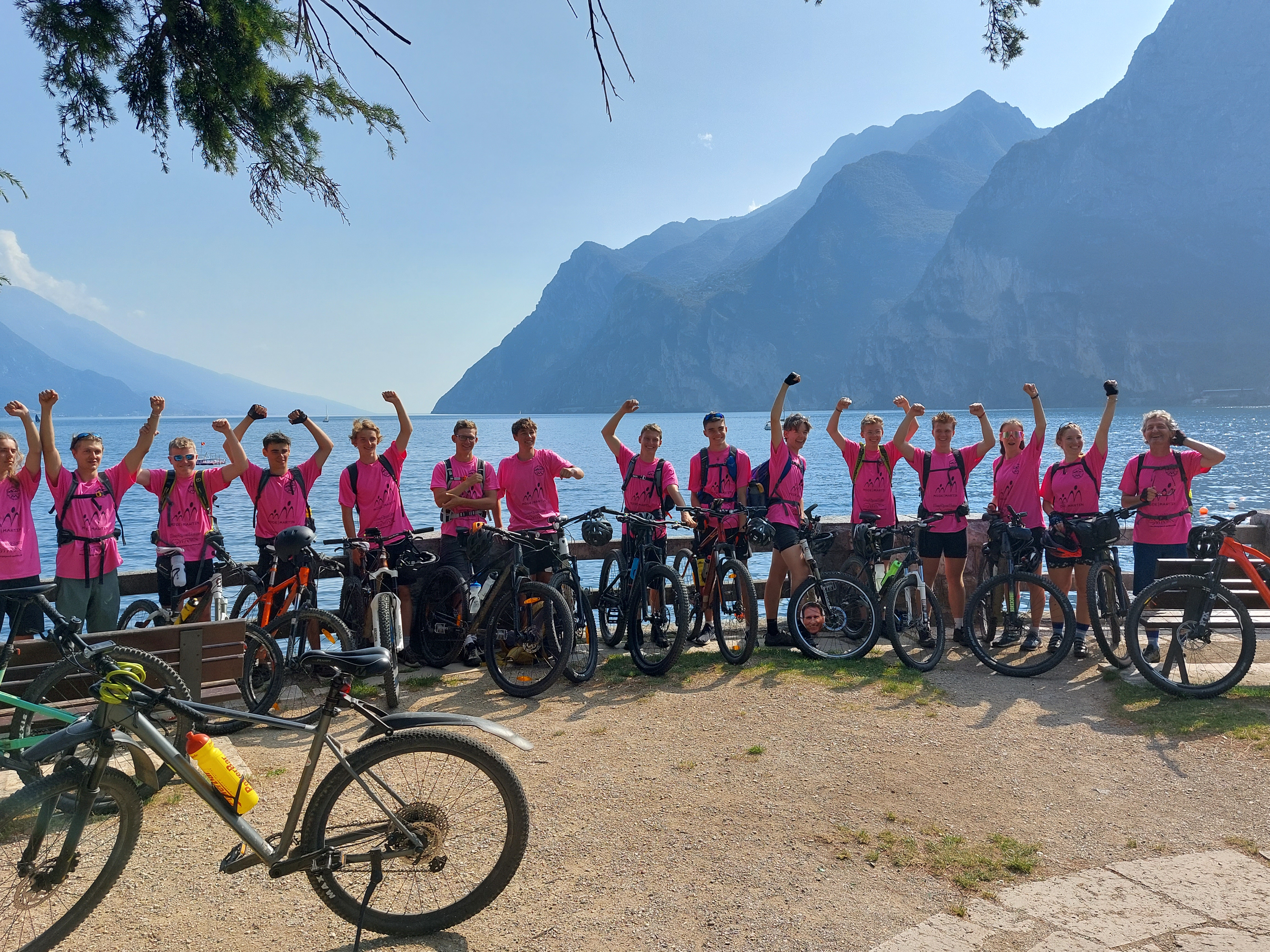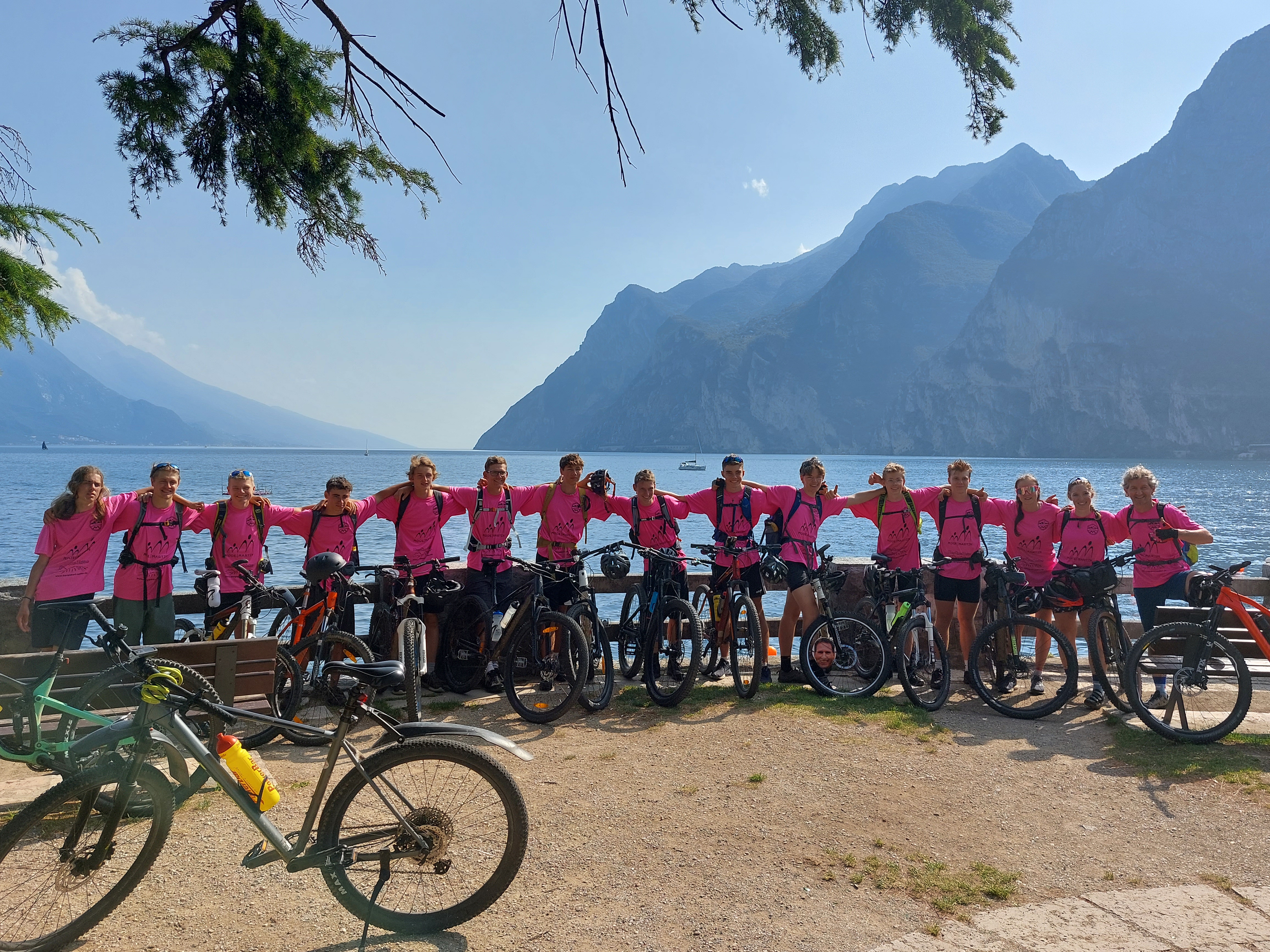 Tag 6: Der letzte Tag steht an und die Motivation vom ersten Tag ist bei jedem wieder spürbar, der Gardasee ist nur noch eine Tagesetappe entfernt. Zu Beginn geht es erst noch einige hundert Höhenmeter aufwärts, nach denen wir erstmal eine Pause machen. Die Mittagspause findet heute also schon nach ca. 10 km von insgesamt etwa 50 km statt. Trotzdem fühlen wir uns hier schon wie am Ziel, denn das waren die letzten Höhenmeter für diesen Alpencross. So können wir nach der Pause von ca. 1800 m ü. NN. runterrollen bis zum Gardasee auf nahezu Seehöhe. Glücklich und zufrieden rollen wir in Riva del Garda ein und können stolz behaupten, „Wir haben die Alpen überquert“. Nachdem wir die Räder dann für die Rückfahrt am nächsten Tag verladen haben, wird dies natürlich gebührend gefeiert mit gemeinsamen Pizzaessen und anschließendem gemütlichen Beisammensein mit Eis & Cocktails.