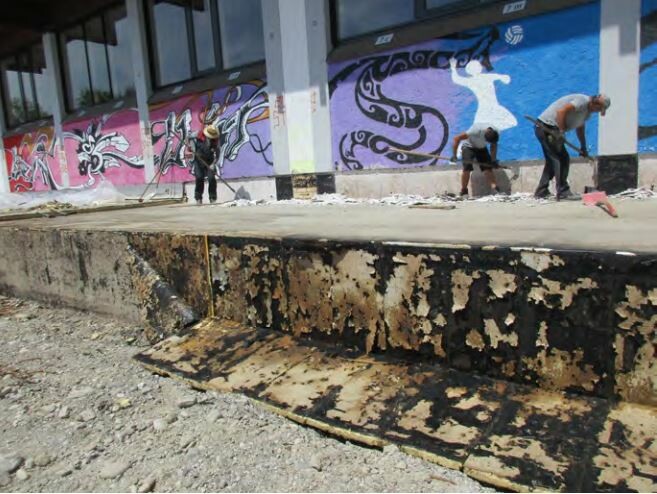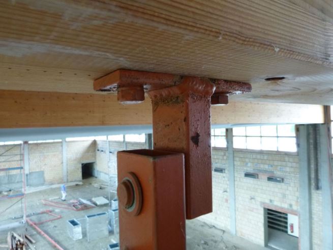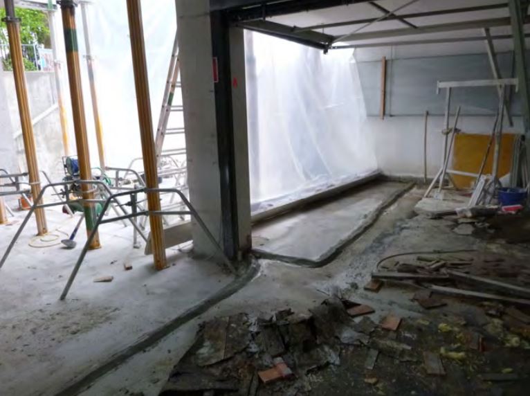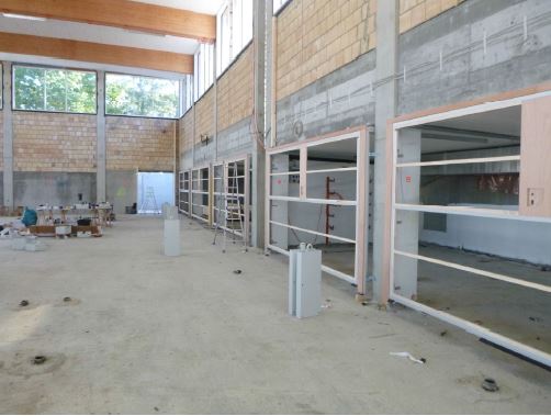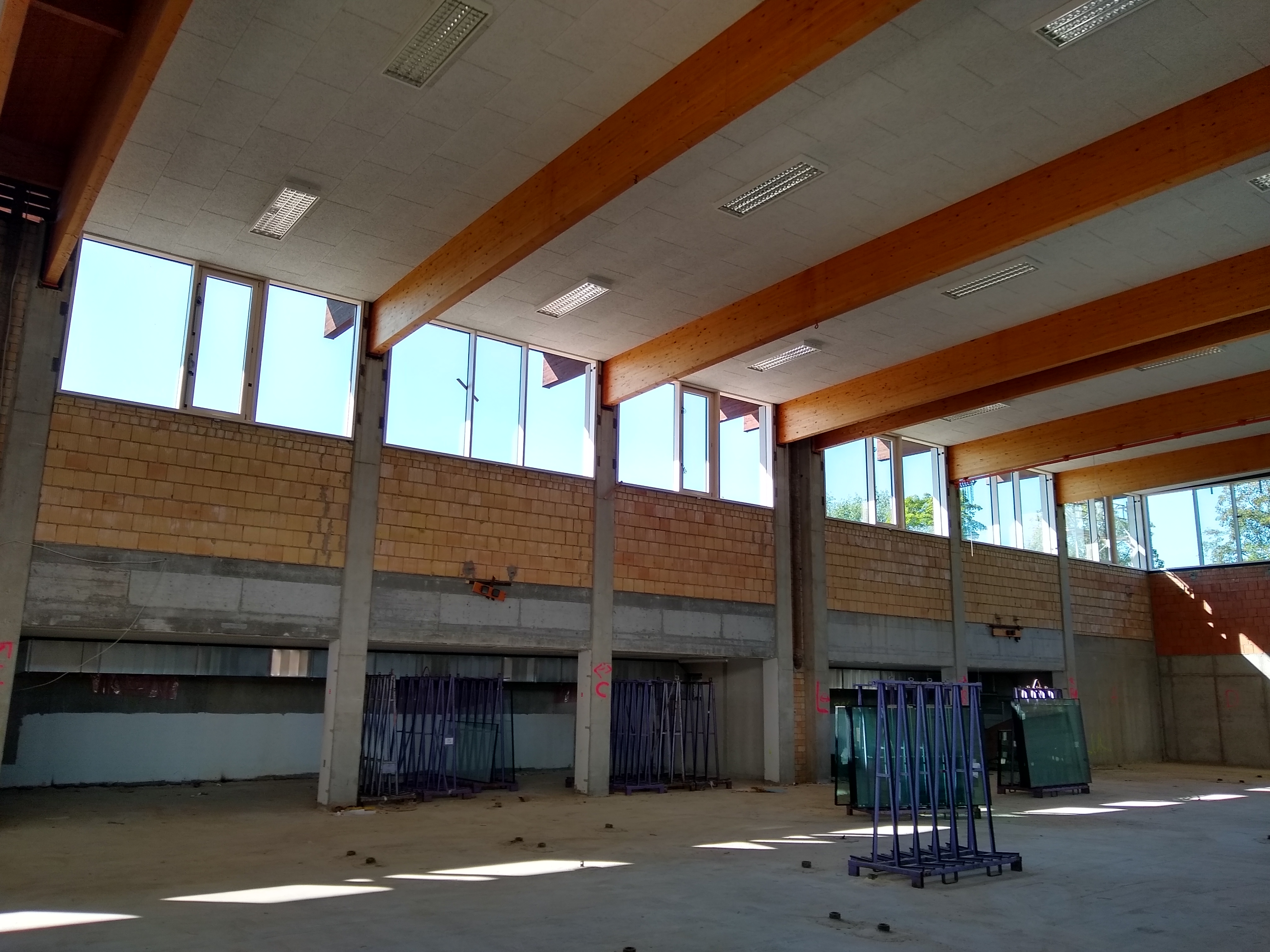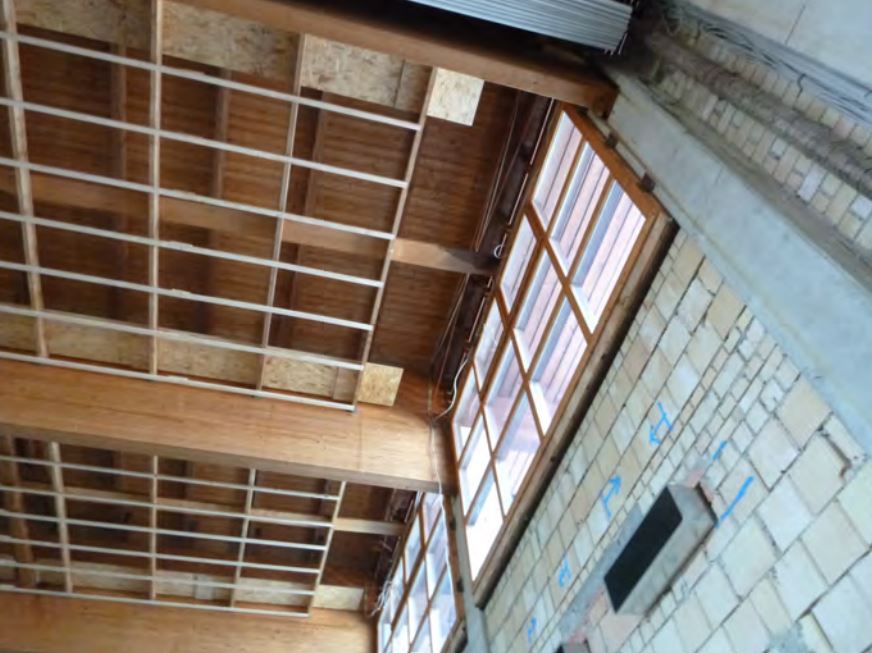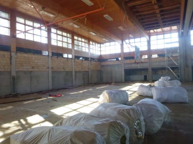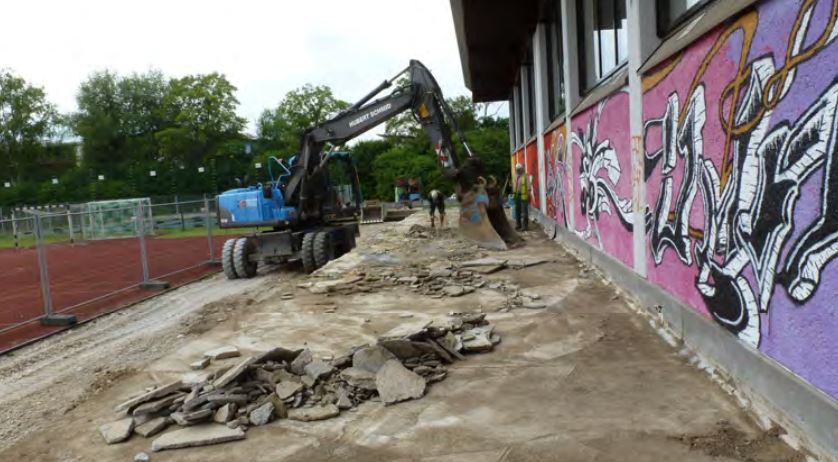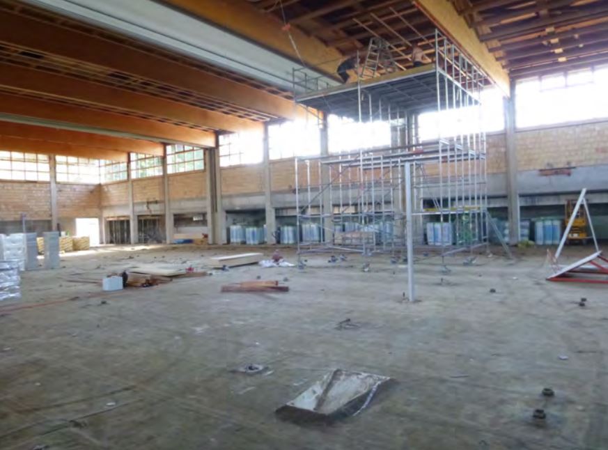 In dieser frühen Bauphase war noch geplant, die alten Hallenfenster zu erhalten. Nach dem Rückbau der Prallschutzwände zeigte sich jedoch sehr schnell, dass die Substanz der Fensterstöcke derart marode war, dass ein Austausch unumgänglich wurde.