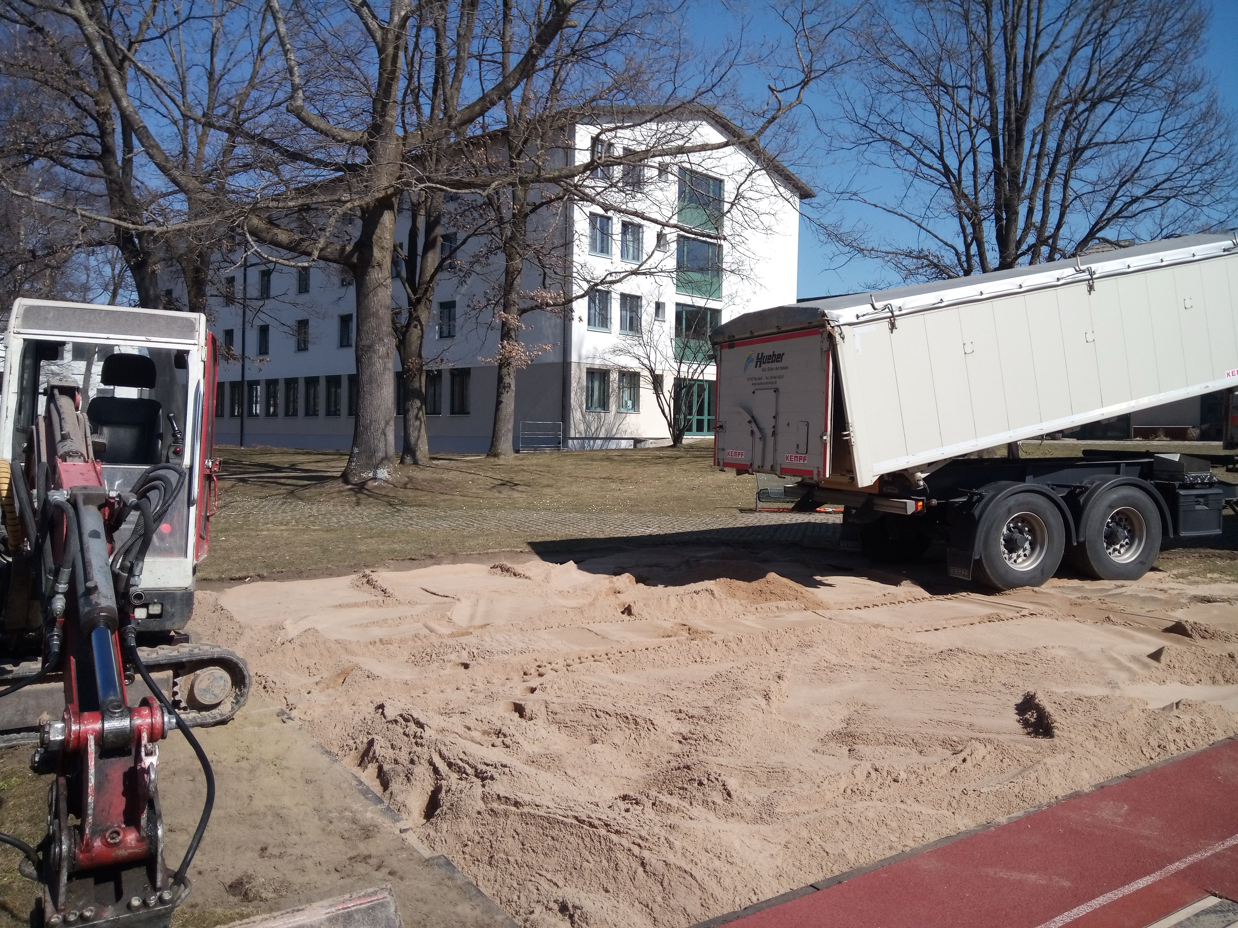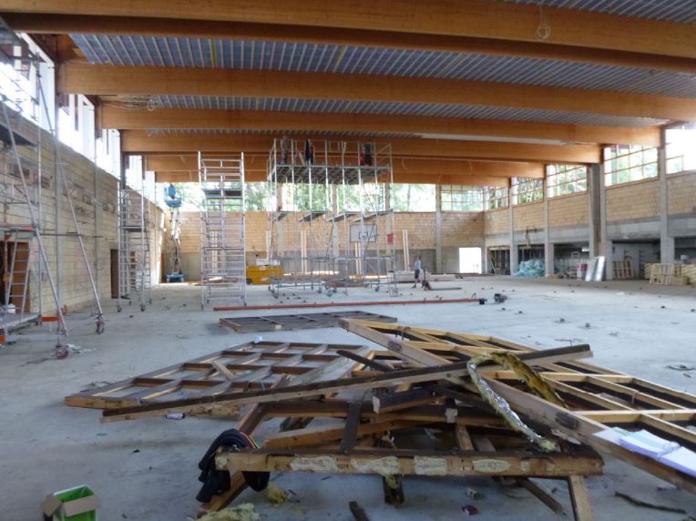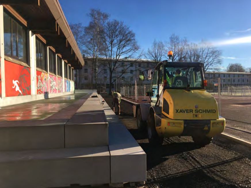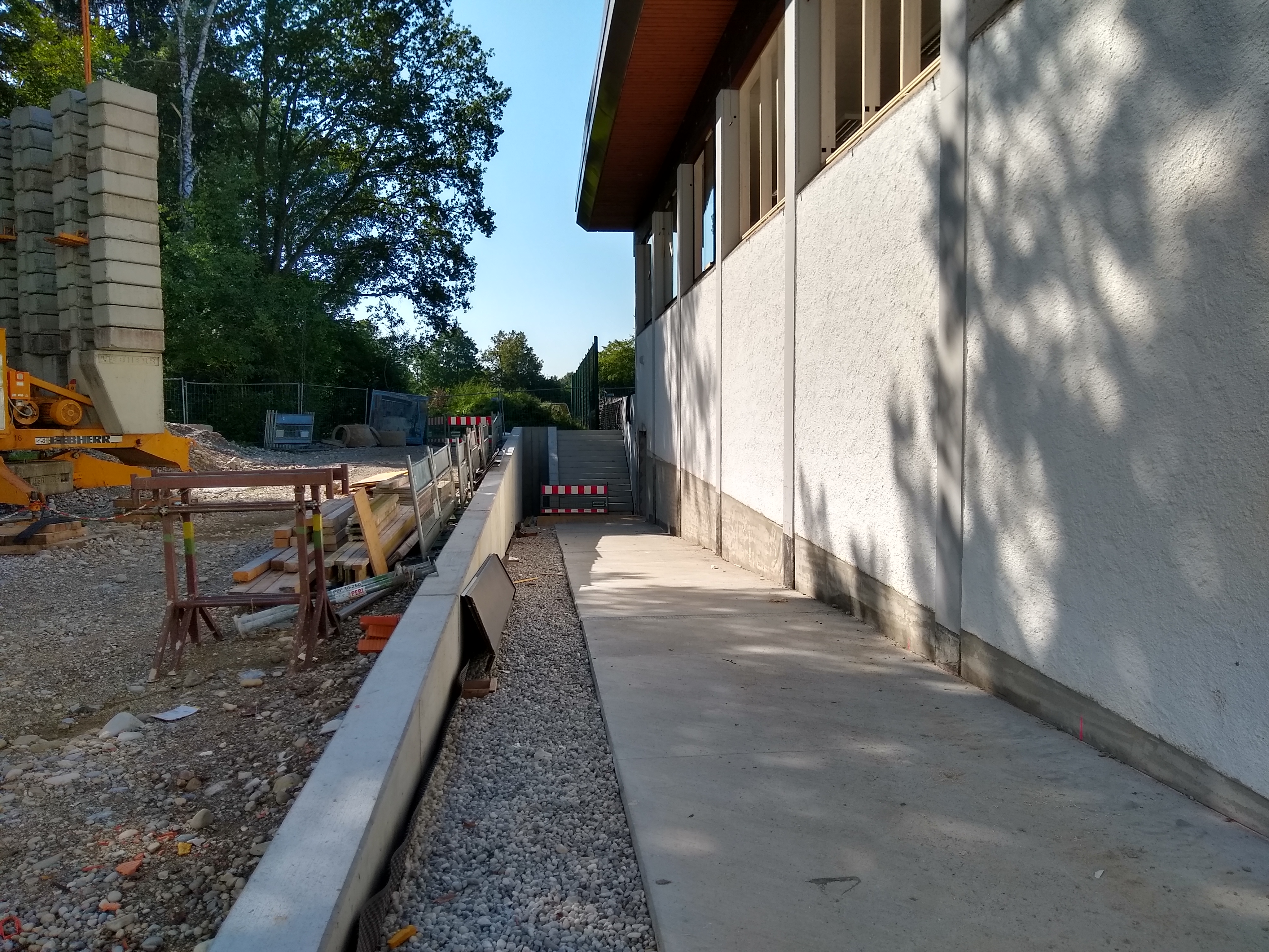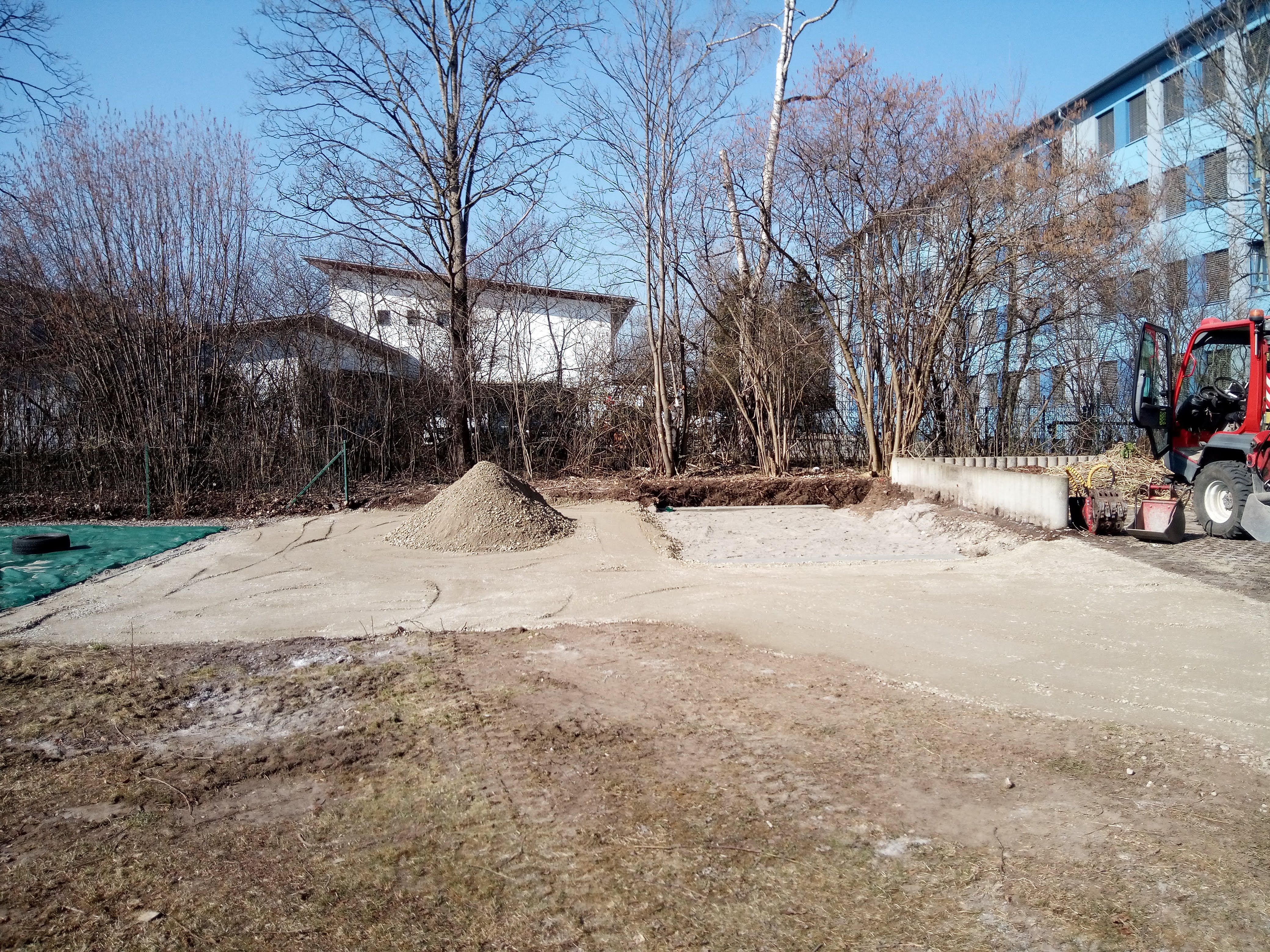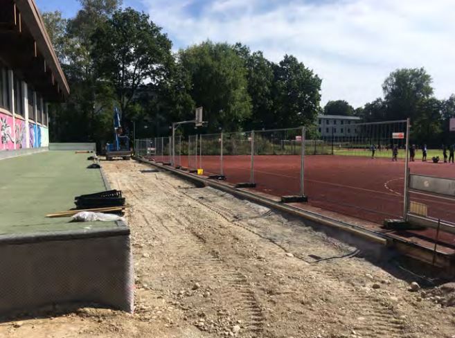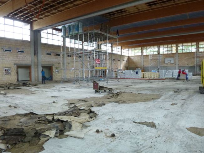 Nach intensiver Planungszeit mit zahlreichen Sitzungen im staatlichen Bauamt Kempten wurde ab März 2018 mit den ersten Arbeiten begonnen. Zu Beginn wurden alle Sportgeräte in den auf dem Pausenhof West aufgestellten Containern eingelagert. Auch der Mehrstationenturm des Kraftraums wurde von der Fachschaft Sport in mühevoller Kleinarbeit zerlegt und eingemottet. Alle Sportgeräte, die während der Bauphase für den "alternativen" Sportunterricht benötigten wurden fanden im Atriumsgebäude des Gymnasiums im Keller U-042 einen Platz. Während der gesamten Bauzeit fand der Sportunterricht, sommers wie winters, überwiegend im Freien statt. Lediglich in einigen wenigen freien Zeitfenstern konnte der Sportunterricht in der Stadionhalle, der MS-Halle oder der Berufsschulhalle stattfinden. Wir danken an dieser Stelle der RS Mod, der MS Mod sowie der Berufschule Mod für die gute Zusammenarbeit!