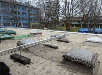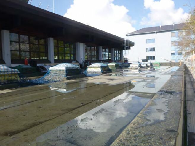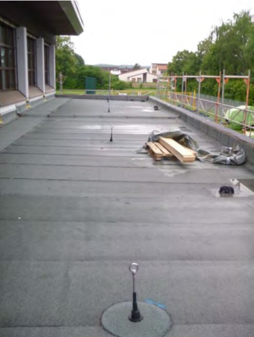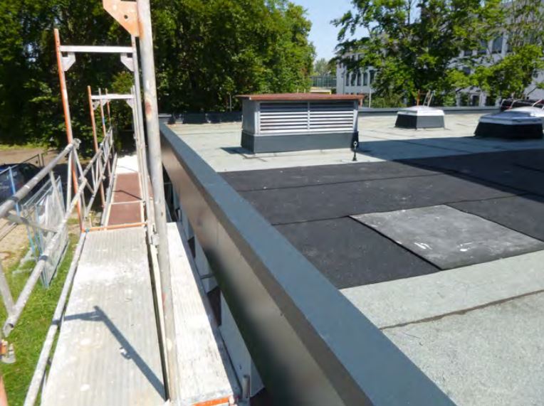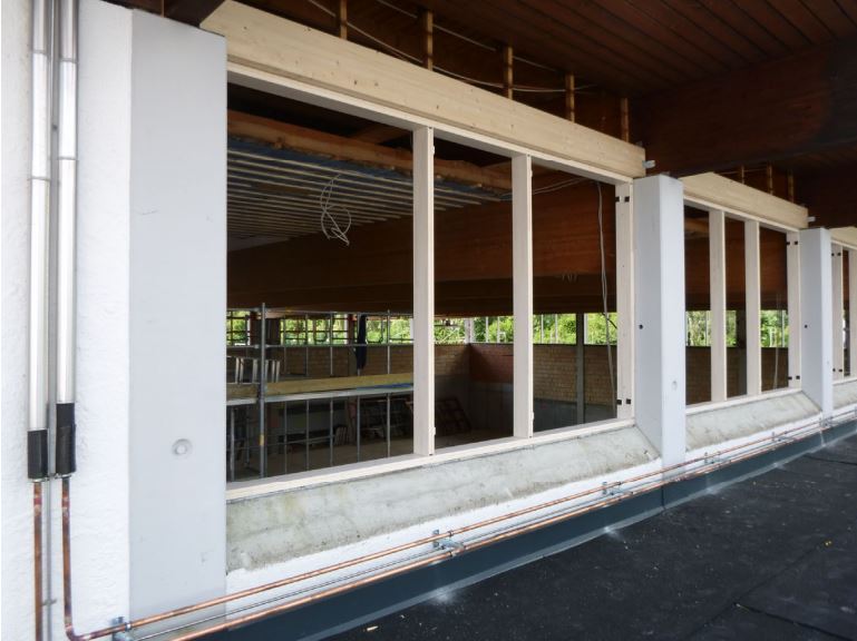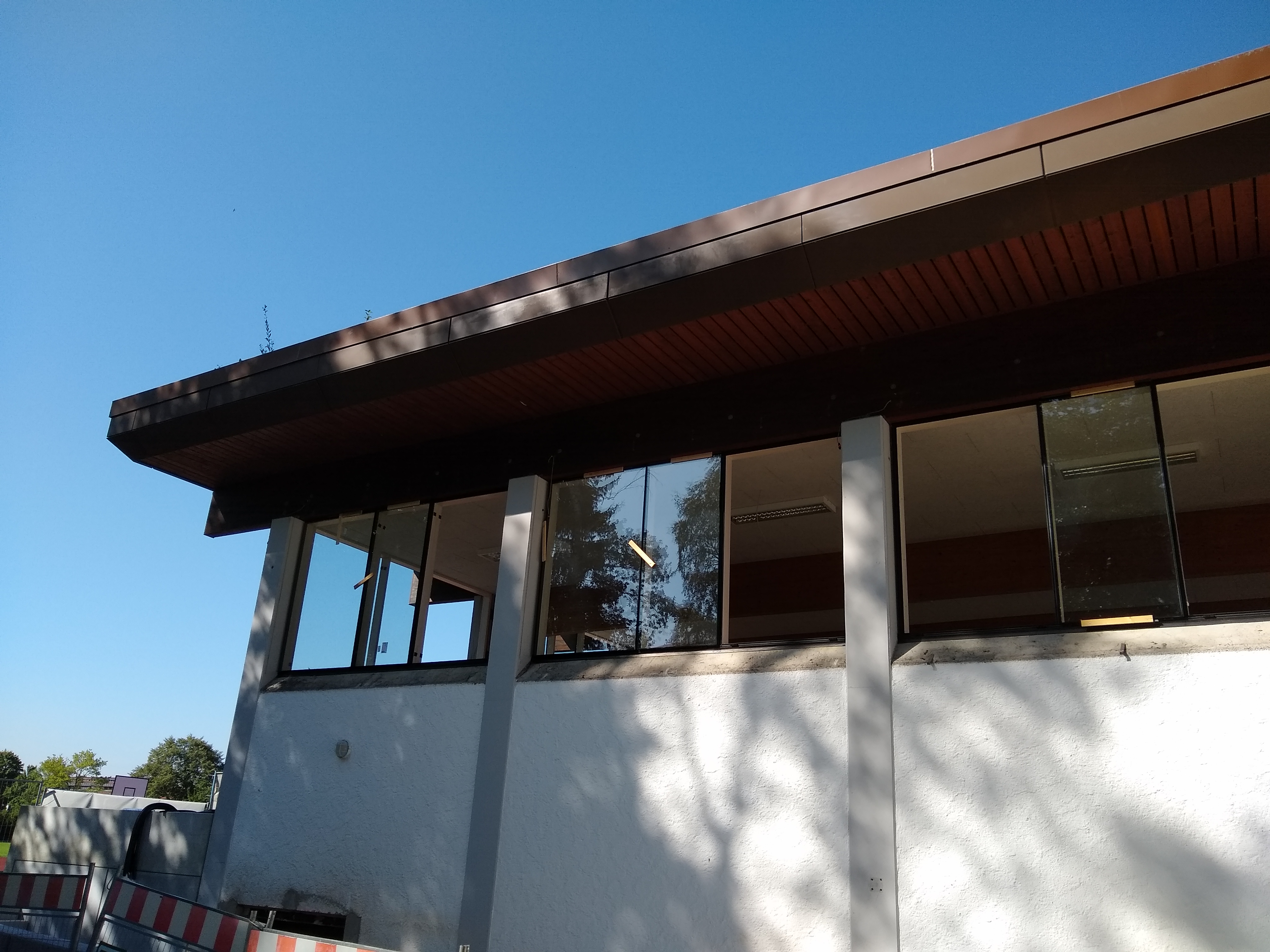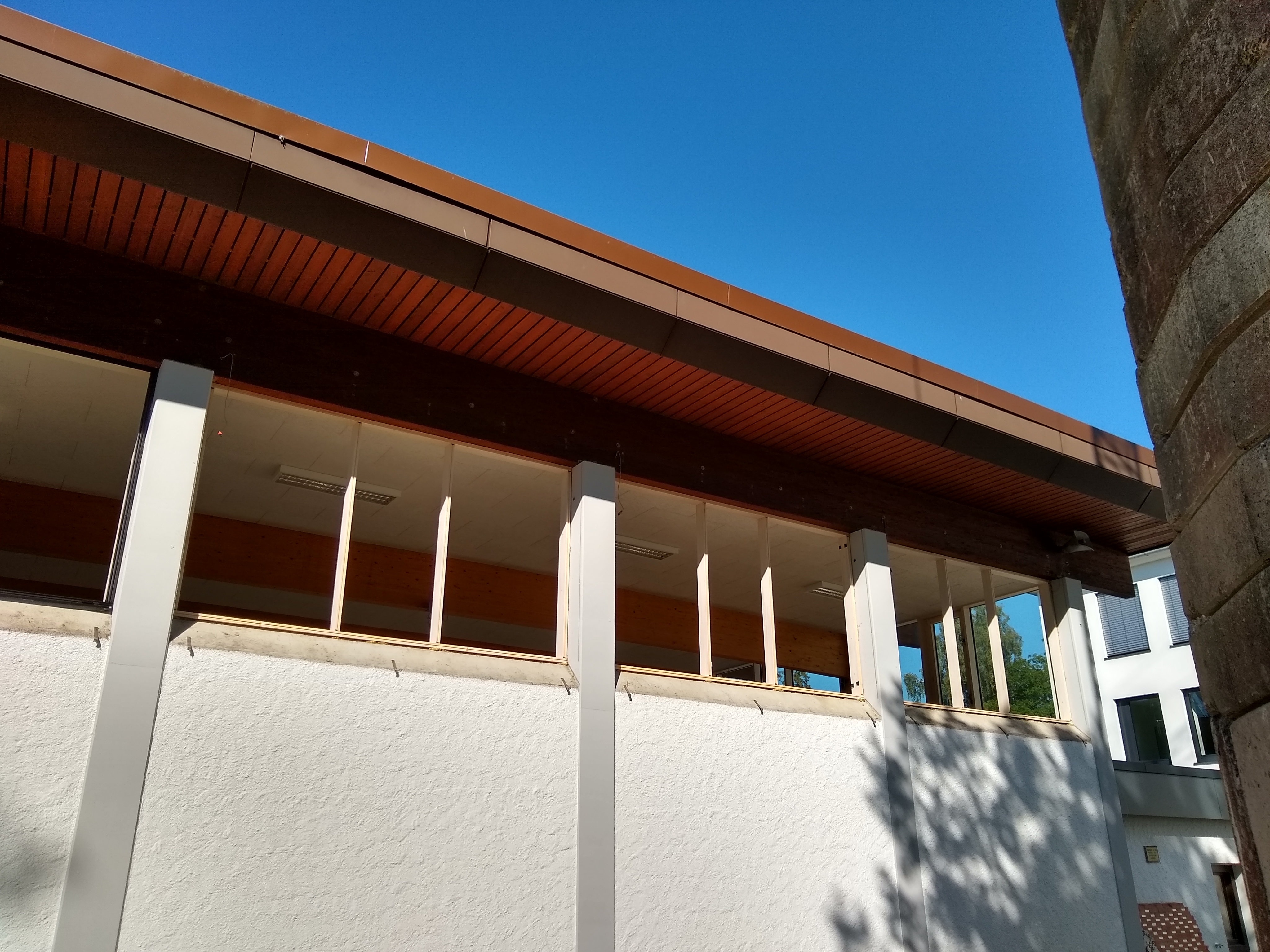 Die Sanierung der Dachflächen wurde von Anfang an in zwei Bauschritten geplant. So wurden die niedriger gelegenen Dachflächen im Zuge der großen Baumaßnahme ertüchtigt. Die Sanierung des Hallendachs wurde bereits zu diesem Zeitpunkt auf den Sommer 2023 eingeplant.