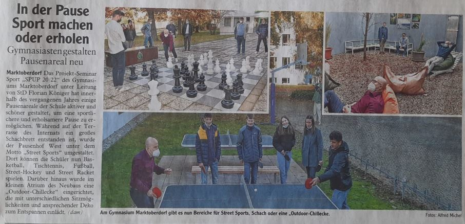 Wir vom P-Seminar Sport 2020/21 „SPUP“ haben uns Eure „Pausen-Erholung“ zum Ziel gesetzt. Wie Ihr sicherlich mitbekommen habt, hat das SPUP-Team in den vergangenen Monaten drei ausgewählte Pausenhöfe für Euch umgestaltet und ein neues mannigfaltiges Pausenangebot geschaffen. Auf der Internatsterrasse steht nun ein großes Gartenschachbrett bereit. Hier können die begeisterten Schachspieler die eine oder andere Schachpartie an der frischen Luft ausspielen, um „Matchpraxis“ zu sammeln, neue Strategien auszutesten und um sich dabei zu erholen.